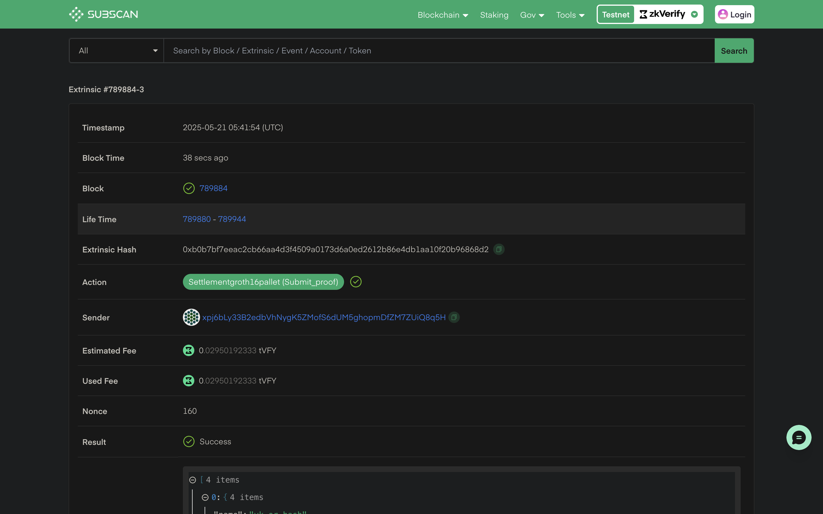 可在 zkVerify Explorer 用日志中的 txHash 查看已验证的证明。
